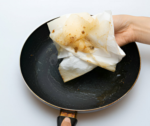 Nah, sebelum langsung dicuci, biasakan untuk mengelap permukaannya dulu dengan tisu dapur. Pilih tisu yang agak tebal dan bertekstur kasar supaya bisa menyerap minyak dengan maksimal. Lap perlahan seluruh permukaan alat masak sampai sisa lemak terlihat berkurang.